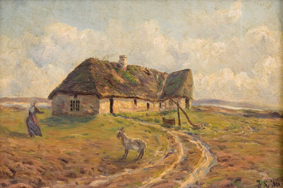 Hedebillede (med stråtækt hus)