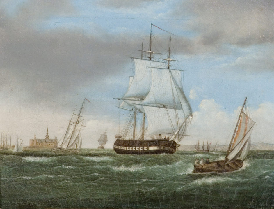 Orlogsskibe og sejlere udenfor Kronborg1875